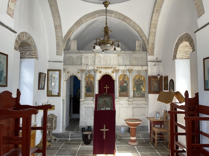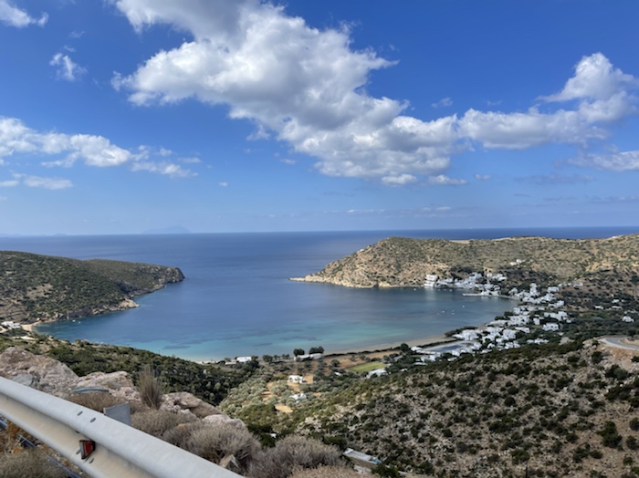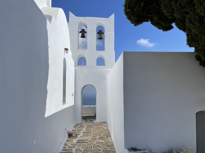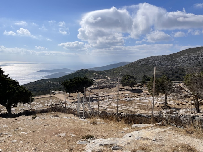 The island of Sifnos where we are today has an area of 28.3 square miles. That makes it a bit bigger than Skiathos where we were last week. This morning we went exploring in the south part of the island. We went up to a the archaeological site and church of Aghios Andreas. The Mycenaean wall found at the archaeological site is from the 12 th century BC. The church is much newer. They have a wonderful view.