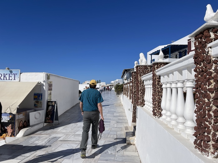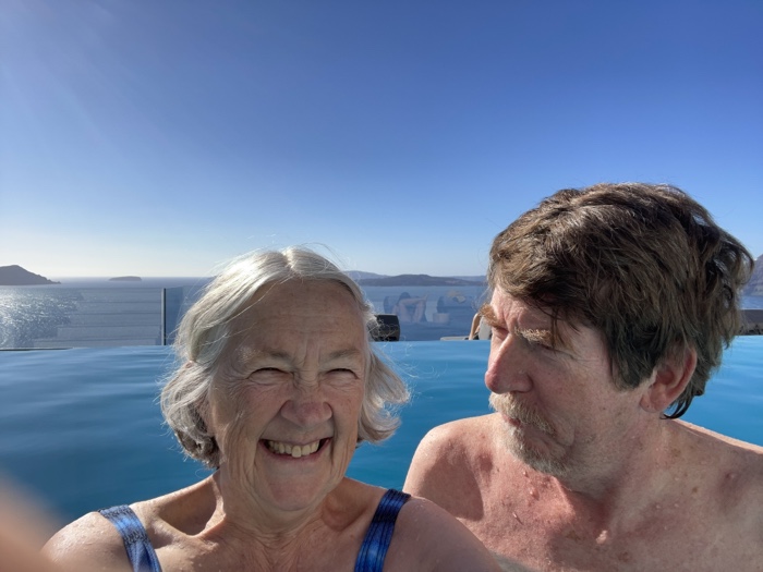 Santorini is incredibly, strikingly beautiful. I had no idea! Santorini the island we are on and the other islands we can see are what is left of a giant volcano. All the hotels covering the hilltops are on what’s left of the rim. I’ve been reading about it today. The Santorini volcano last erupted in 1950. It’s on a list of volcanoes near populated areas that are active and could erupt again, volcanoes like Mount Ranier, Mount Vesuvius and Mauna Loa.
