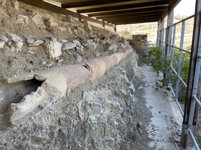 Today we had a wonderful time exploring Naxos. As we were driving into the mountains northeast of the town of Naxos we saw a sign for a roadside historical site. When they built the road they uncovered part of an 11 km long clay pipe aqueduct built at the end of the 6th century BC. It connected springs at Flerio where we were headed to Naxos.