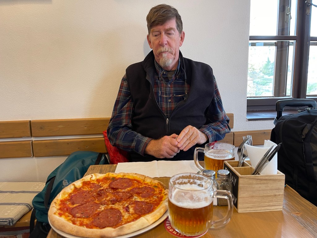 From the bus station we walked towards the place where we are staying, Pension Kristian. We knew that we couldn’t check in until 3 so we found a restaurant and had beer and pizza. We worked on the NYT Sunday crossword puzzle to kill time while we waited.