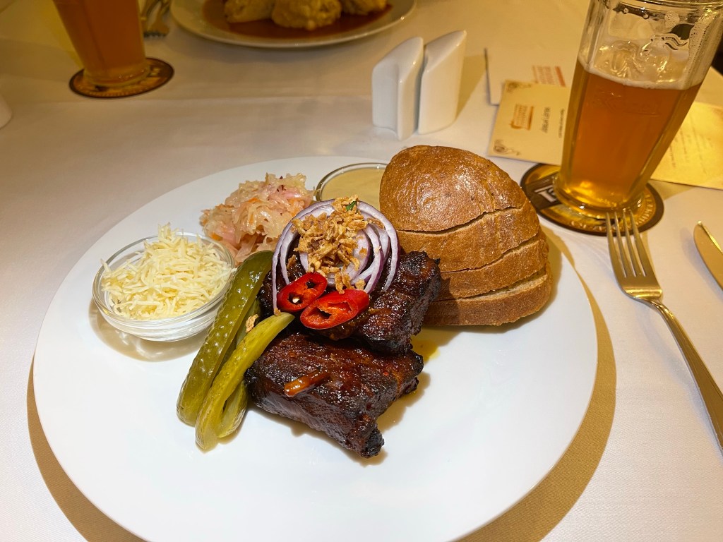 For dinner tonight we ate at the restaurant at our hotel. Dining experiences are a big part of why we enjoy traveling. We had local beer. If you look at the pork rib picture below you can see the grated horseradish, the sauerkraut, the pickles and the brown bread. I guess fresh horseradish must be traditionally Czech. We have had it multiple times and it is so good. Plus that is a lot of horseradish!