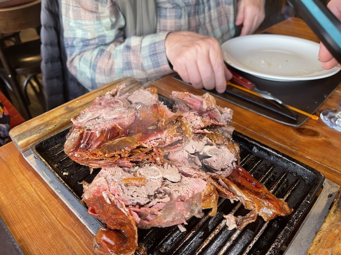 In Calafate we are staying at Design Suites Calafate overlooking Lago Argentina. We went to a steak house called Don Pichon for dinner. Nobody does meat like the Argentineians. Bonnie and Brian had a lamb platter for two and Duke and I had a barbecue platter.