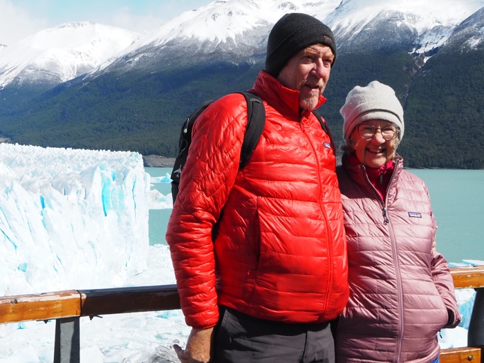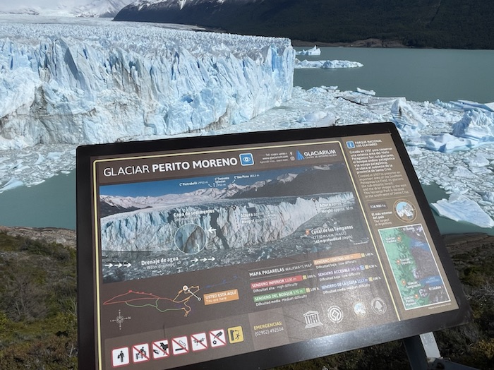 Today we drove 47 miles west from El Calafate to visit the Perito Moreno Glacier. The Glacier is massive. The height at the highest part of the glacier at its front on Lago Argentina is more than 70 meters. The width at the widest part we could see is more than 2.5 kilometers. There are extensive raised walkways all over the hill across from the face of the glacier. We walked for an hour or more all along them. The National park has done an excellent job with interpretive signs.