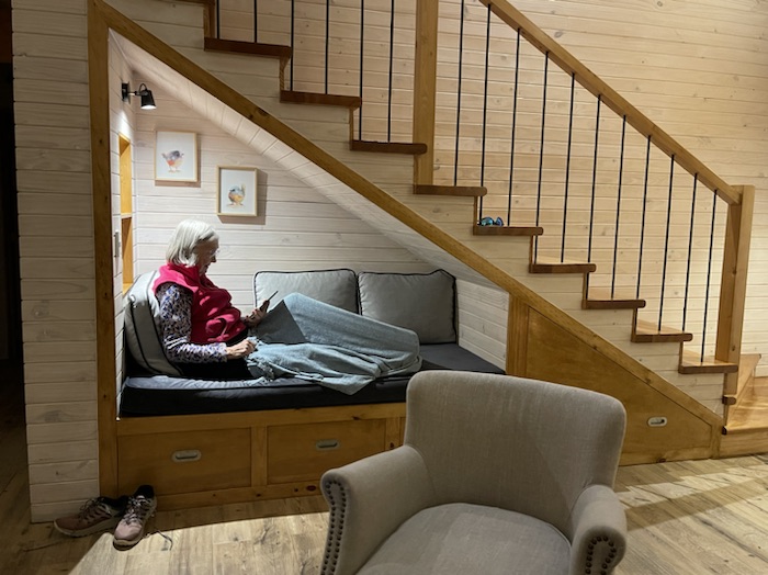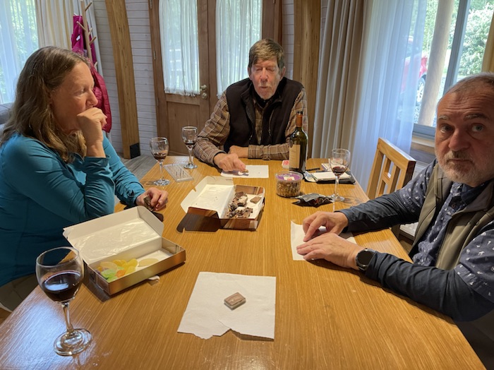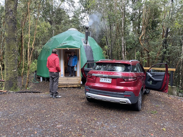 It rained all day today. We found coffee at a park visitor center not too far from Ensenada then drove to Futrono where we are tonight. Last night at Cabañas Ensenada Bosque Nativo we were in a very rustic small geodesic dome. Bonnie and Brian had to get up every two hours to put wood in the wood stove. Our stove was a bit bigger so we only got up a couple of times.