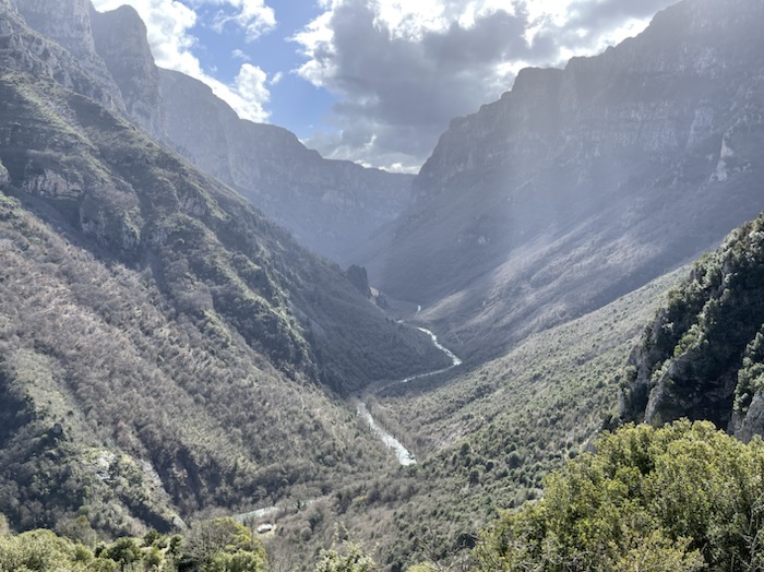 Before we headed to Corfu, where we are tonight, we drove in the other direction to a viewpoint overlooking. Vikos Gorge. Lots of people do raft trips through the gorge. We saw at least 5 trailers with rafts on them going towards the put in point.