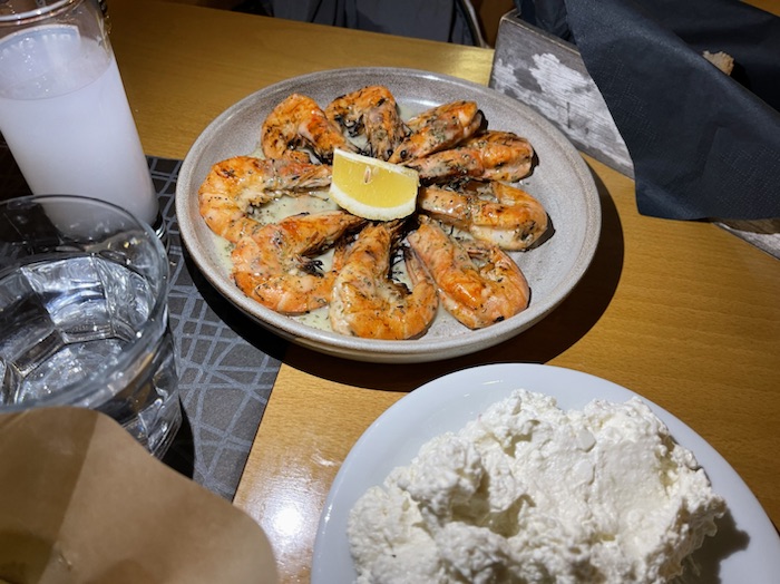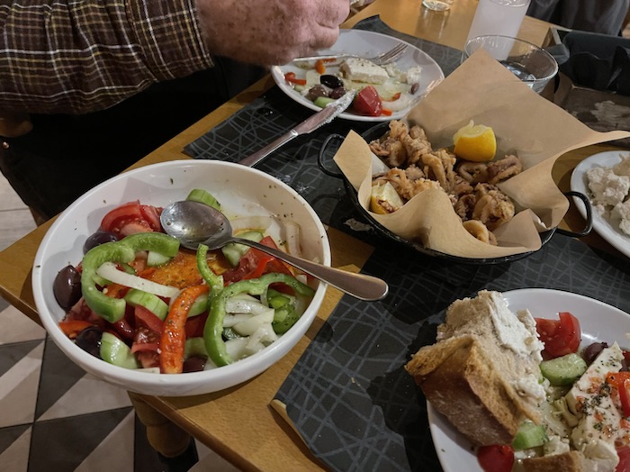 Greek salad and squidShrimp. You can see one of our glasses of ouzo in the picture.