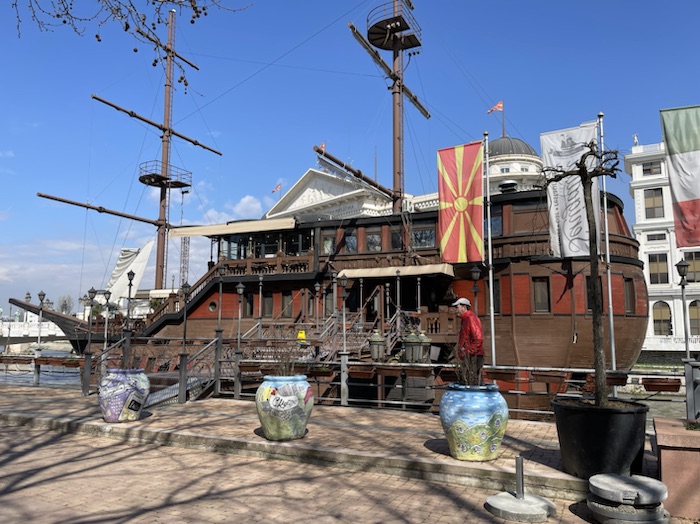 Our hotel in Skopje was built in the river. It was built to look like a ship. We had breakfast this morning on the top floor.