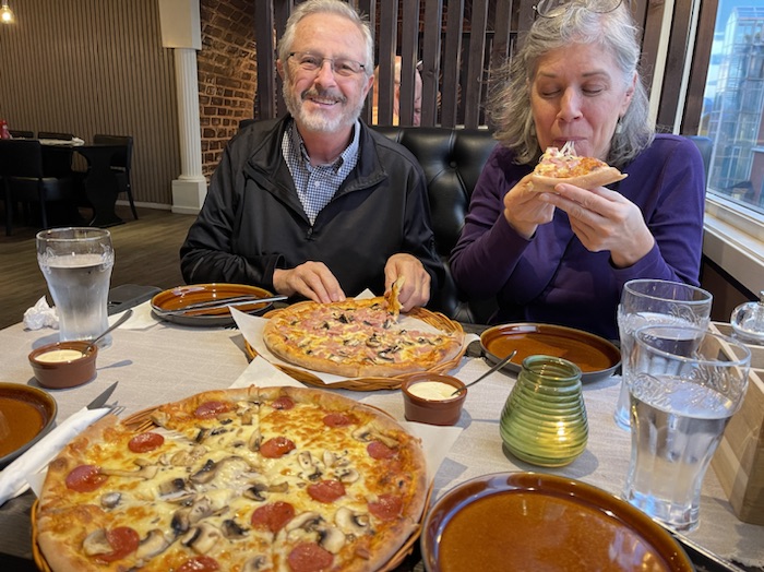 We played some cards in the bar on the top floor of the hotel. Later we had a pizza for dinner at a nearby restaurant.