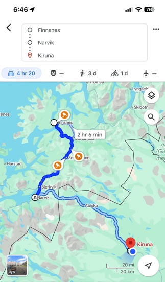 We got off the Havila Polaris on Thursday in Finnsnes and took the bus to Narvik where we spent Thursday and Friday nights. This morning we took a train 3 hours and 20 minutes east and a bit south to Kiruna, Sweden.