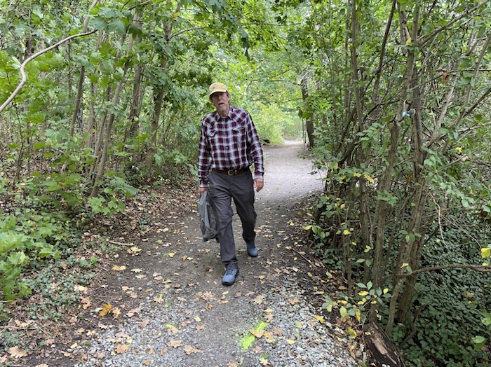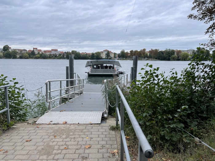 Today we walked halfway around the Lake in nearby Strausberg. The lake has an electrically driven cable ferry that we took back to our starting point. There is an overhead power line across the lake. The cable powers the ferry. The distance between the electrical towers is 370 meters.