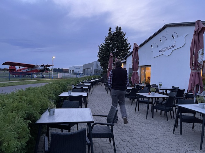 For dinner we went to a nearby restaurant called Restaurant Doppeldecker across the street from the local airfield. The reviews mentioned an airplane parked across from the restaurant. We thought the name was referring to a double decker aircraft. But after seeing the plane and the pictures on the wall we realized Doppeldecker meant Biplane in English!