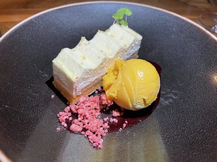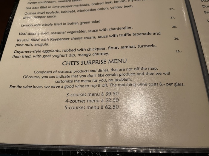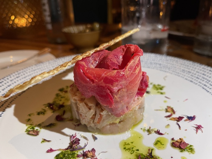 We decided to have the 3 course Chef Surprise menuOur starter was salmon, crab and mackerelThe main course included filet mignon, beet, truffle, fennel and asparagus Desert was kind of like a lemon lime pie with mango sorbet
