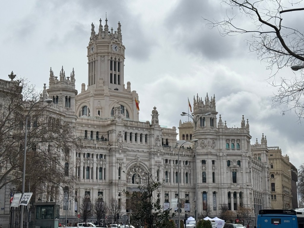 After a coffee break we walked around a bit enjoying the beautiful streets. We both remarked on how clean the buildings are. Then we saw a sign about the exhibits and viewing platform in the Madrid city hall. The Palácio de Cibeles is emblematic of Madrid.
