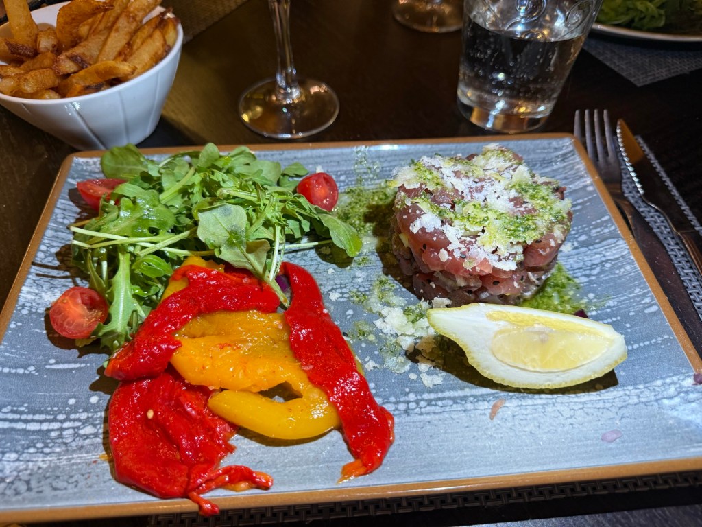 Restaurant La TreilleDuke’s duck leg with mushroomsMy Tuna Tartare with Parmesan We started with Foie Gras. We shared it. I forgot to take a picture before I put half on Duke’s plate. It was delicious.For desert we shared raspberries and cream