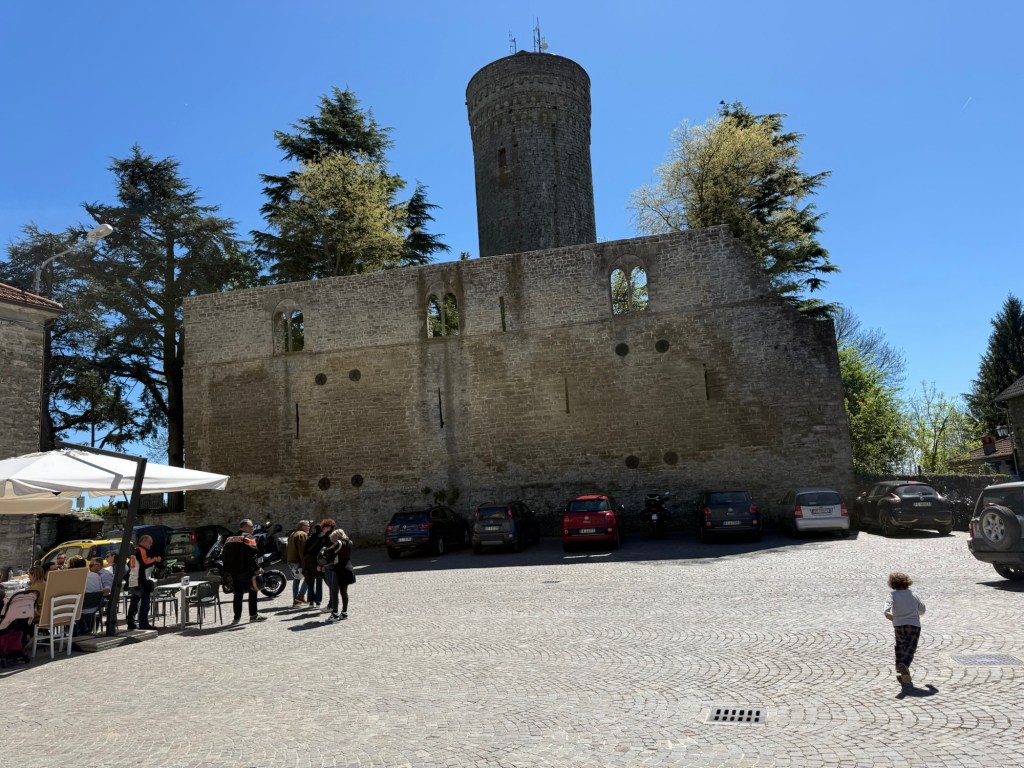 We stopped at Torre di Vengore, a fourteenth century feudal watch tower. Today is Liberation Day in Italy, celebrating the end of World War II in Italy. There were lots of people picnicking. We could see the Alps and Mount Blanc from the hill.