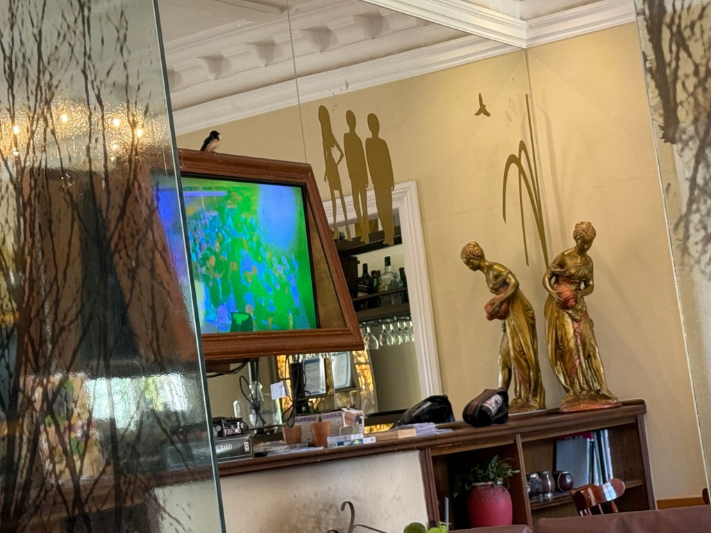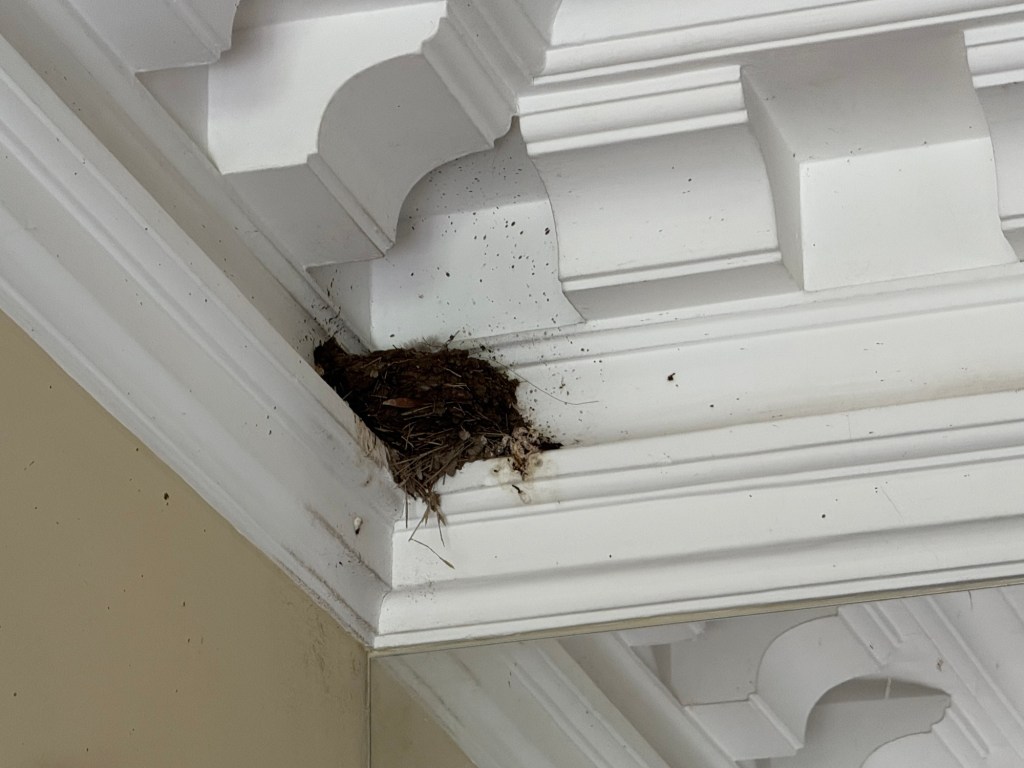 We were surprised when a barn swallow perched on top of the television in the next room. When I pointed him out to the man who set up breakfast and checked us in yesterday, he smiled and said yes. Then he pointed out the swallow’s nest in the corner of the room and said it has 4 eggs in it!