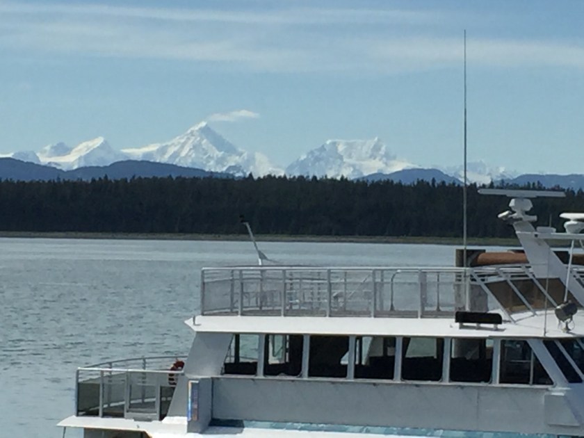 Today we learned that only 10,000 of the 500,000 people that visit Glacier Bay National Park each year touch land and take the National Park Service small boat tour. The rest are on cruise ships. We also heard multiple times today that our weather was unusual. The sun was shining and we could see the Fairweather Range where all the glaciers are formed. The Fairweathers are giant peaks on the horizon. The tallest peak is more than 1000 feet taller than any peaks in the lower forty-eight states.