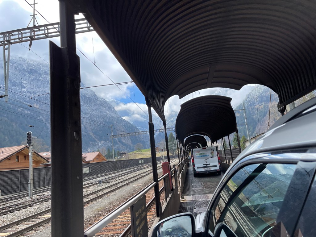 Today we drove southwest into the Alps almost to the Swiss Italian border. The route Google proposed and that we wanted to take had an instruction to “Take the Lötschberg Tunnel Train”. We had not realized when we started that the tunnel train would be part of the route.