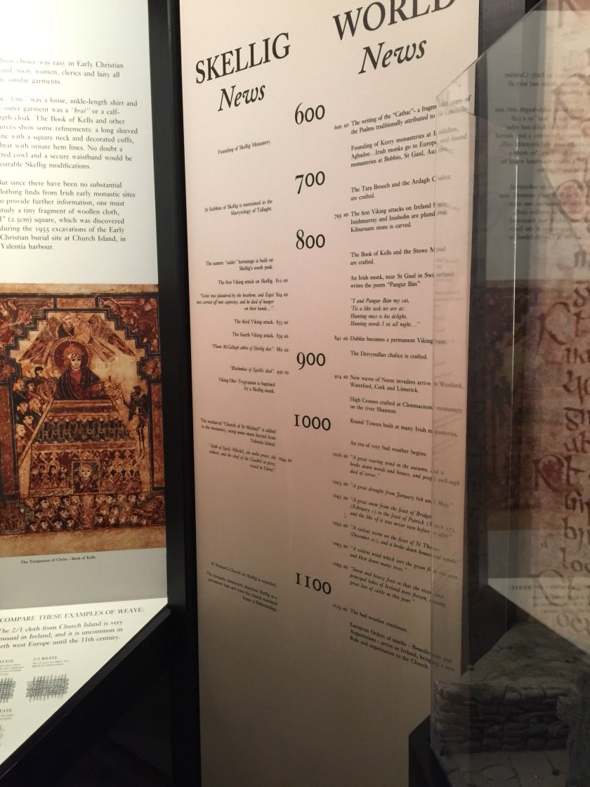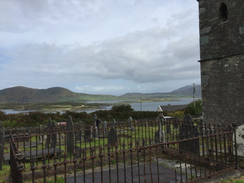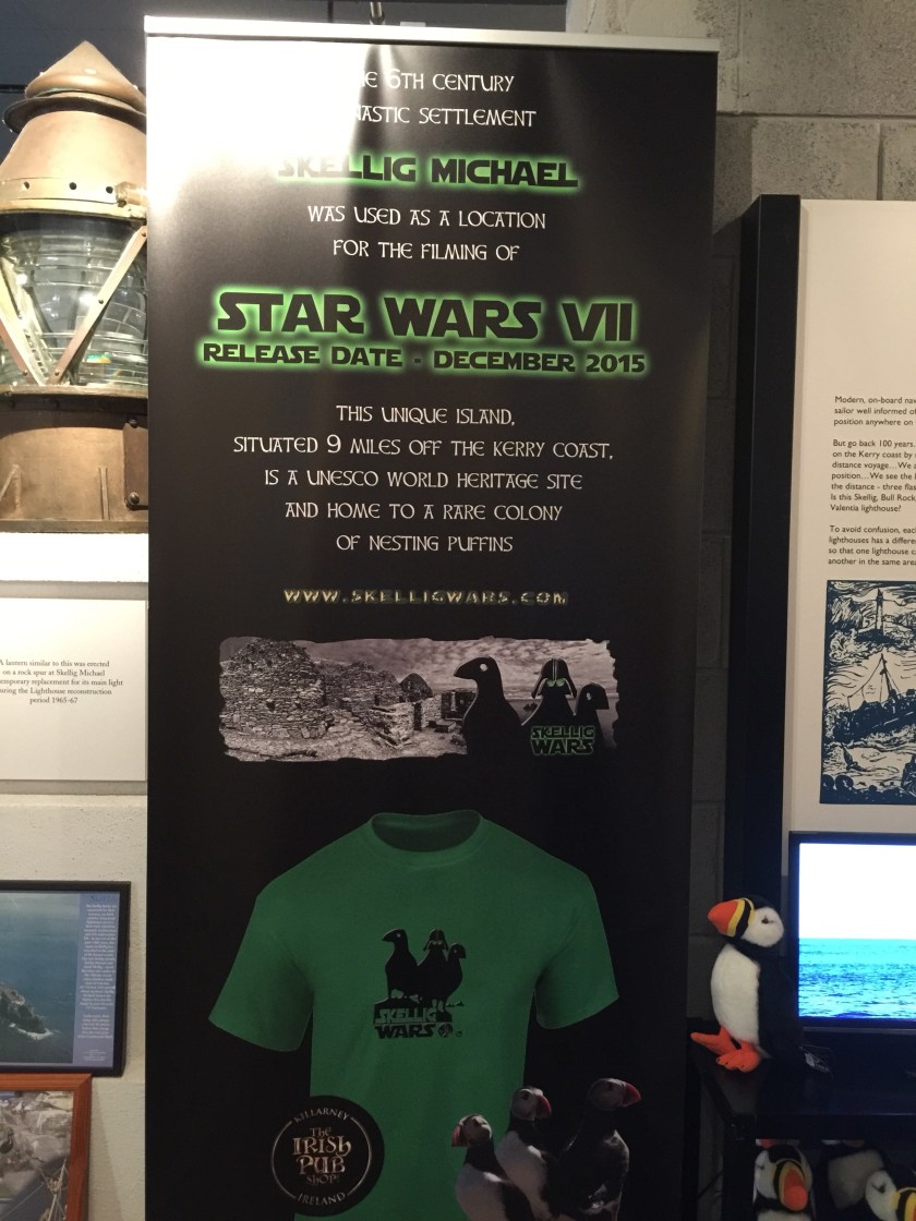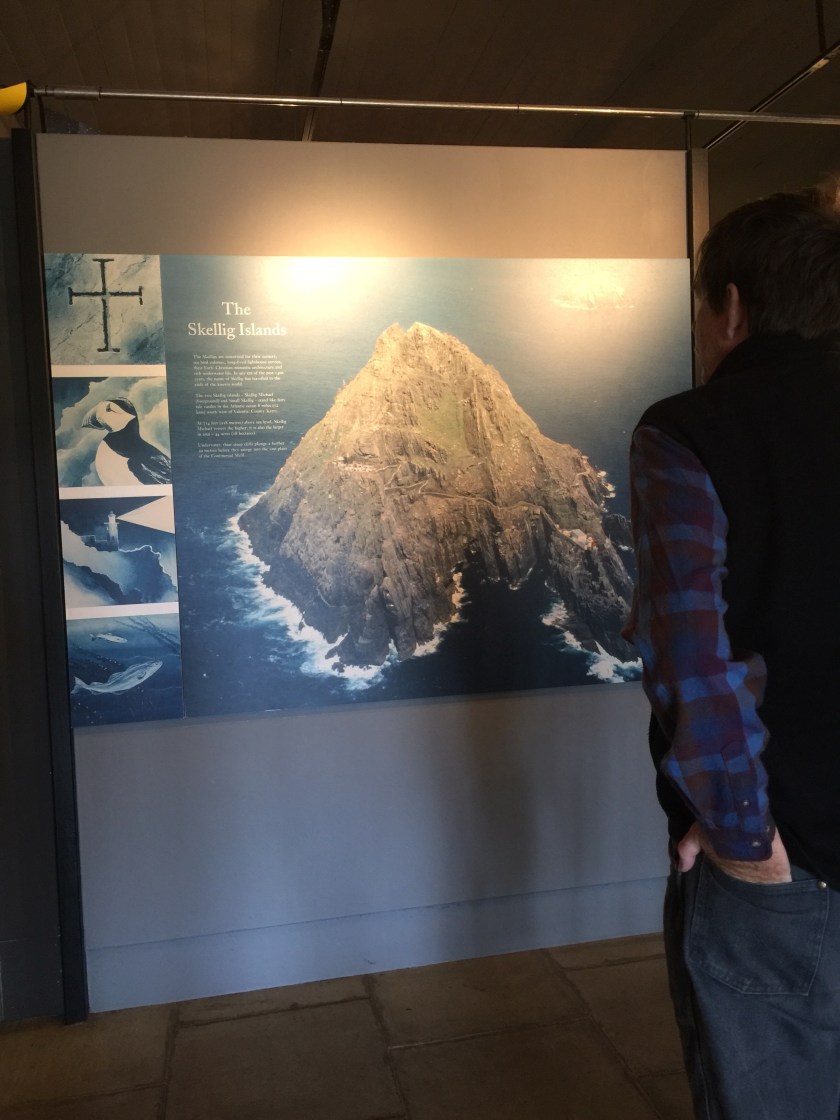 First we stopped at the visitor center for the Skellig Islands. The Islands are a UNESCO world heritage site. One of the rocky island, Skellig Michael was the site of a monastery. During the Dark Ages the monks on Skellig Michael helped preserve literacy and sacred texts. Hikers can take a boat to the island and hike 600 vertical feet up to the monastic ruins. Based on the video we saw in the visitor center it looks like a very challenging boat ride and hike. Scenes from Star Wars VII were filmed on the Skellig Islands.