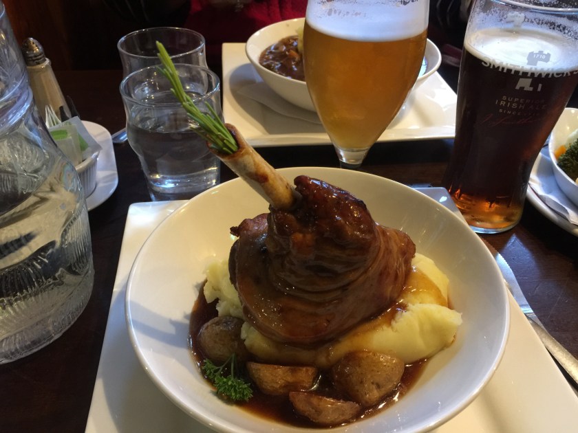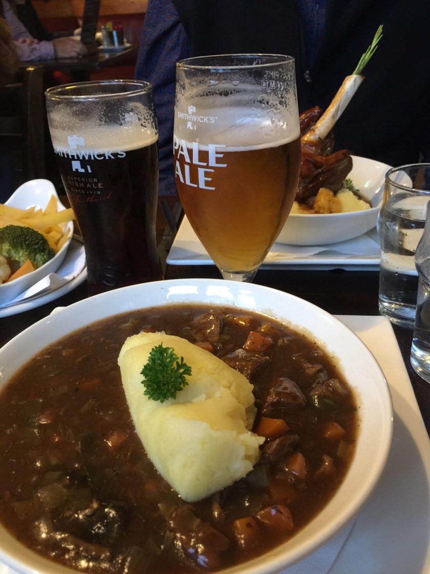 We are dinner at a bar in town. We had lamb shank and beef stew. They were both slow cooked in Guinness beer.