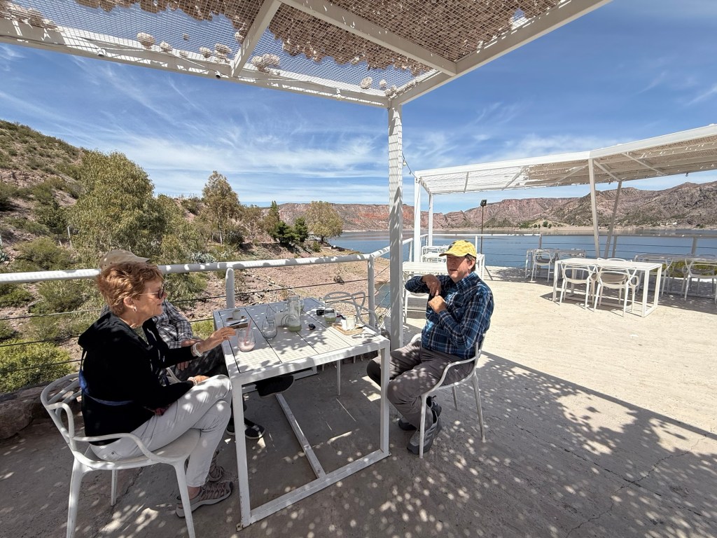 This morning we drove about an hour south of San Rafael to Cañón de Atuel . The bottom of the canyon has a reservoir of the Atuel River in it. We sat an a deck overlooking the reservoir and enjoyed coffee and drinks. I had a lemonade. The reservoir and canyon are beautiful and the weather was perfect.
