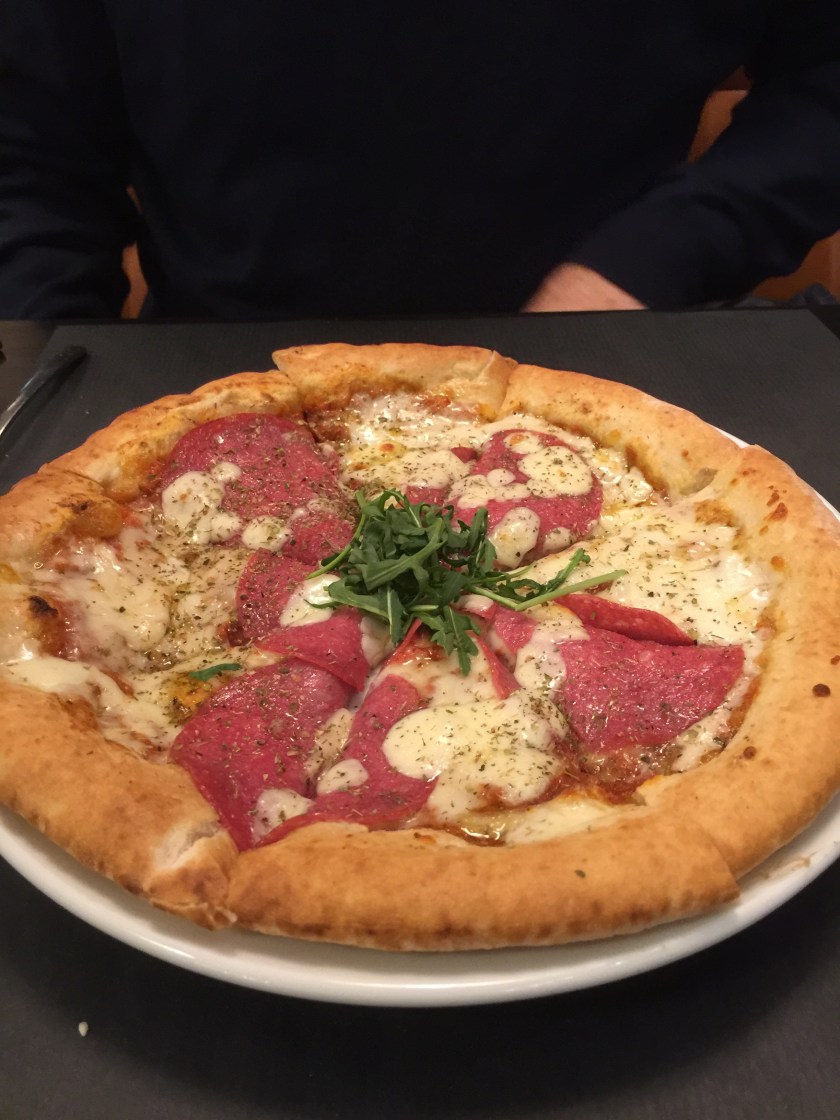 For dinner we had pizza at a nearby bistro. The liter bottle of water was €9 and each glass of wine was €3.50.