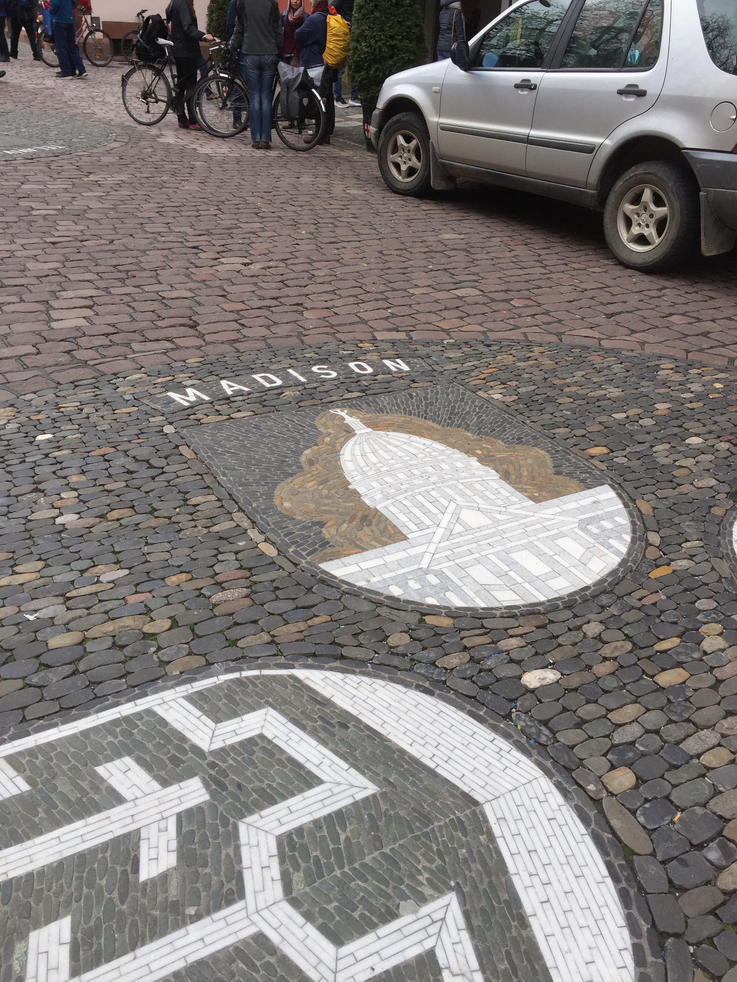 Freiburg is a university town and has some other university towns as sister cities. They have mosaic coats of arms representing these towns in front of the new town hall on Rathausplatz. Madison, Wisconsin is one of the sister cities.
