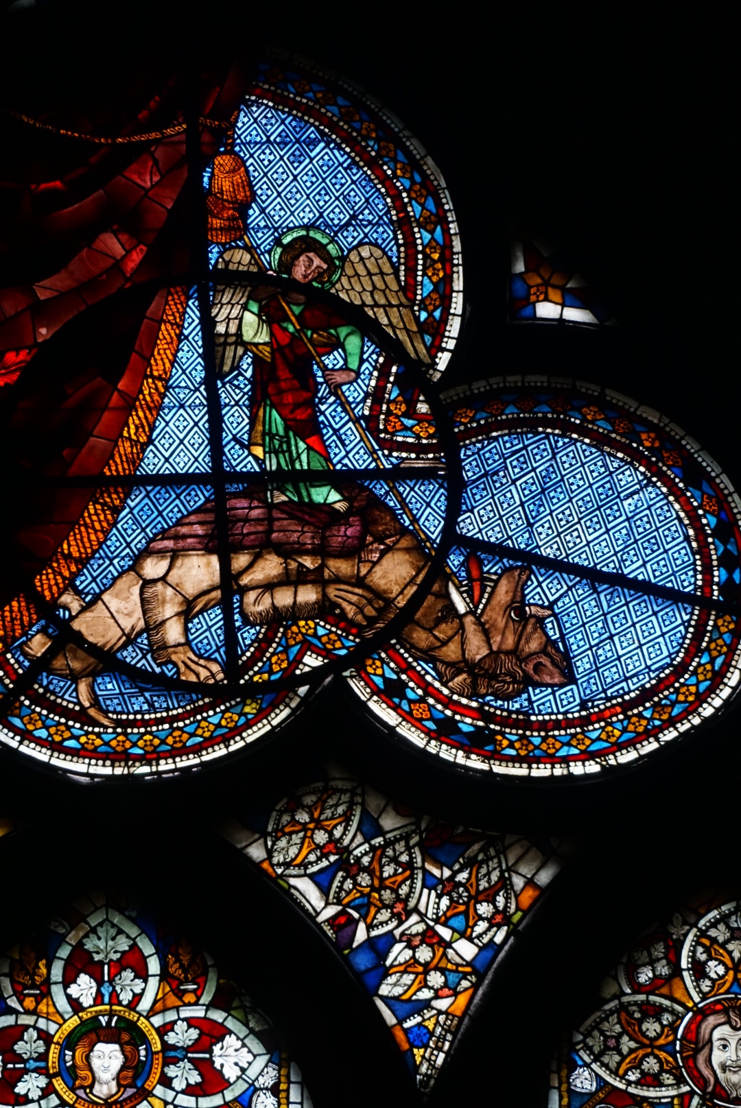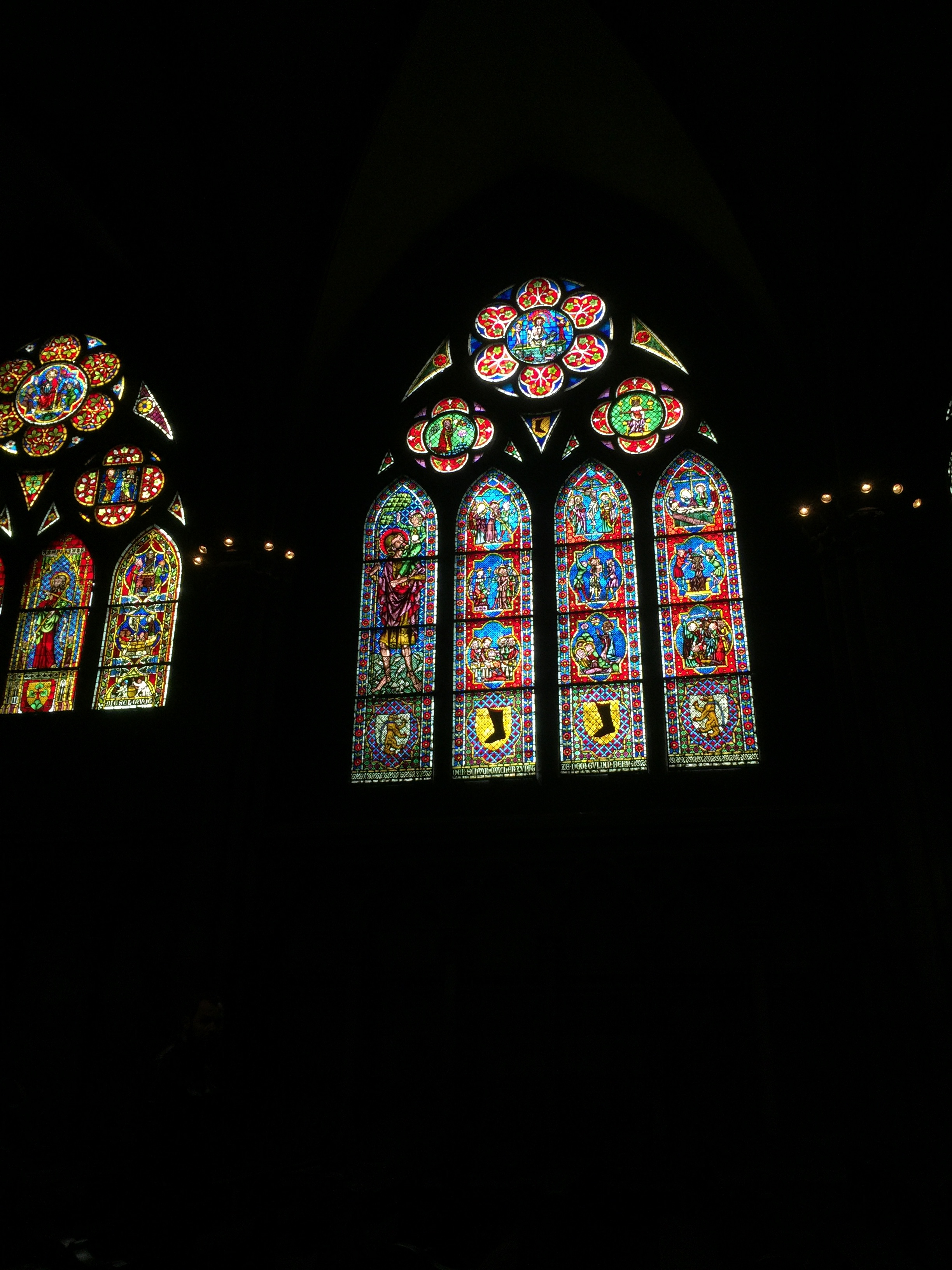 The stained glass in the cathedral is from the thirteenth and fourteenth centuries and was stored away for safe keeping during World War II. Each window has a symbol representing the group that donated it. This one was given by the boot makers.