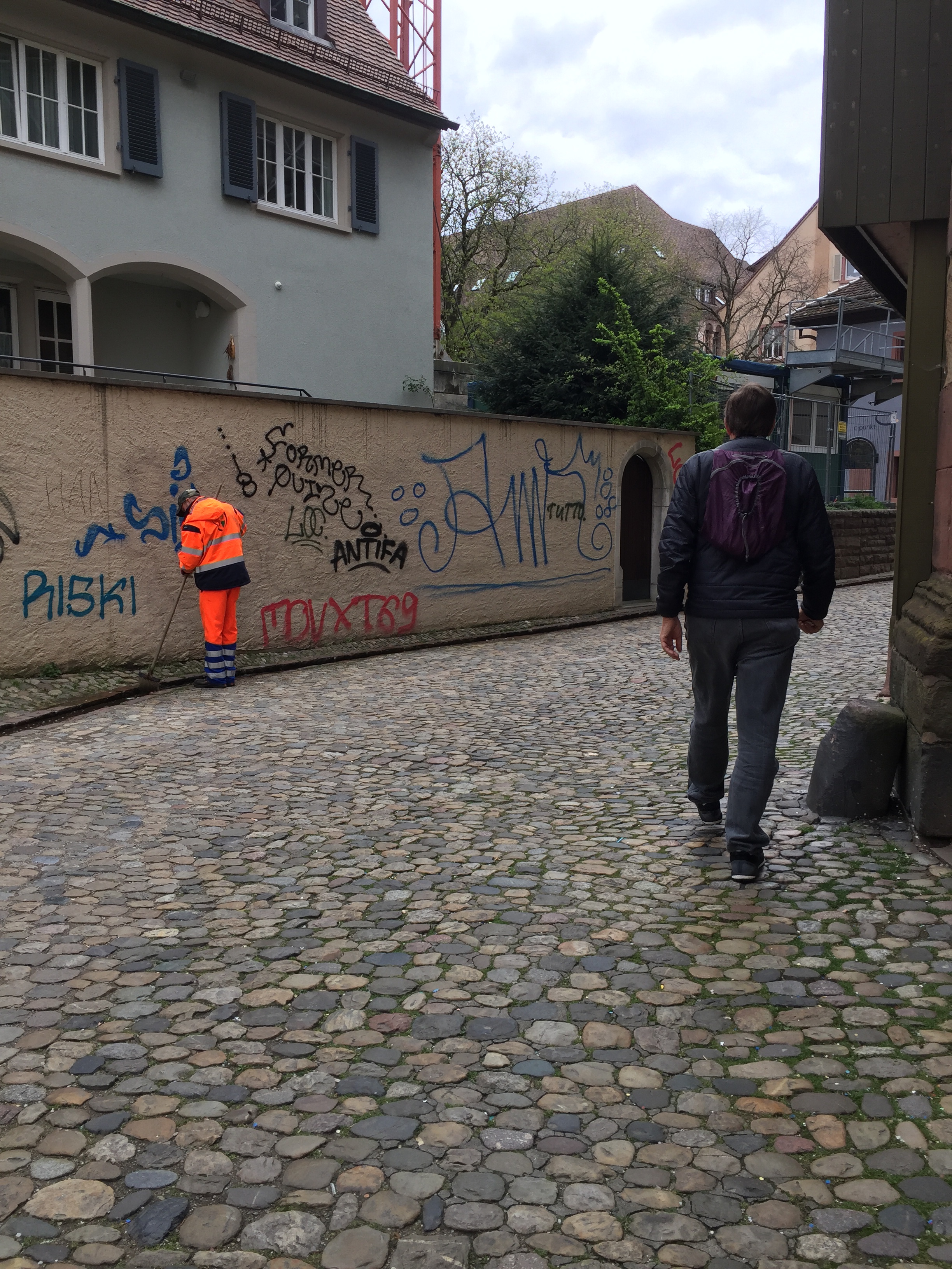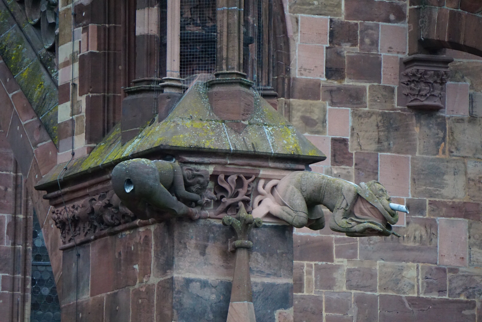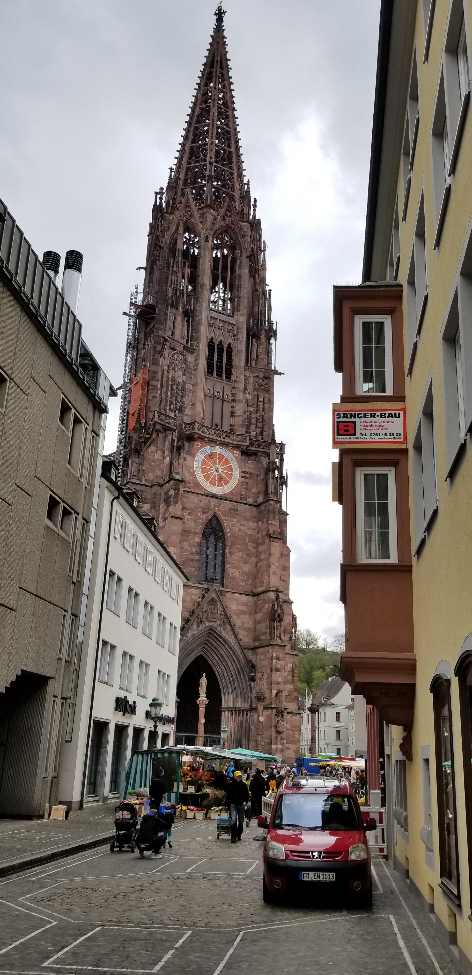 We followed the Rick Steve’s walking tour of Freiburg this morning. At one point we were standing looking at a statue of a gargoyle with a goiter hanging from her neck that decorated a building on a narrow side street. Nearby there was another couple also looking up and quietly reading the same description from the Rick Steves guide book. This isn’t the first time something like that has happened. It’s a real demonstration of the reach of the Rick Steves influence. If I stood there all day I wonder how many people would come by and do what we did!